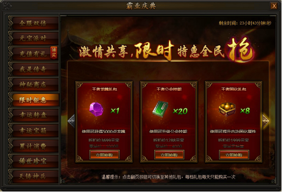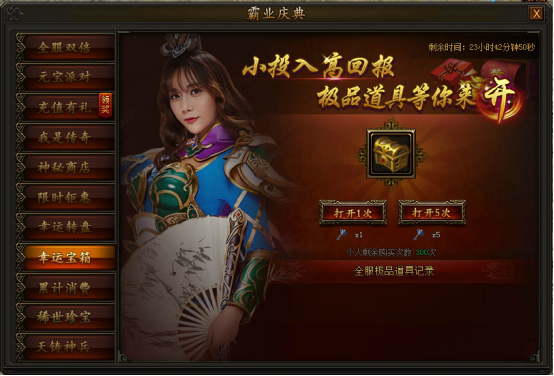 活动期间,80级以上(包含80级)玩家每天最多可打开300次,打开幸运宝箱可随机获得一种道具,多买多得,极品道具等你来开!钥匙可从稀世珍宝中购买经验丹赠送!