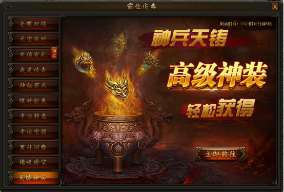 活动期间,天铸神兵限时出现在主城,投入低级神装,花费少量元宝即有机会获得更高级神装,从此快人一步,集齐高阶神装不是梦!